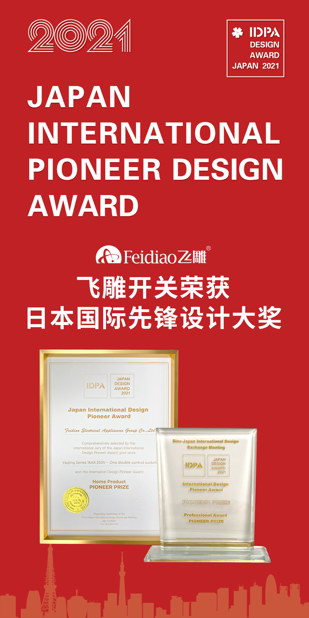 近日,2020-2021“第三届日本IDPA AWARD国际先锋设计大奖”颁奖典礼在日本东京成功举办。经第三届日本IDPA AWARD国际先锋设计大奖组委会对我们参赛作品及行业影响力的层层审核,飞雕开关产品雅清系列荣获国际先锋设计奖!日本IDPA AWARD国际先锋设计大赛面向全球征集具有影响力的设计师、设计机构、设计作品等旨在促进全球及中日两国最前沿的设计文化、设计理念的相互融合发展,实现各国交流合作、发展共赢的愿景。