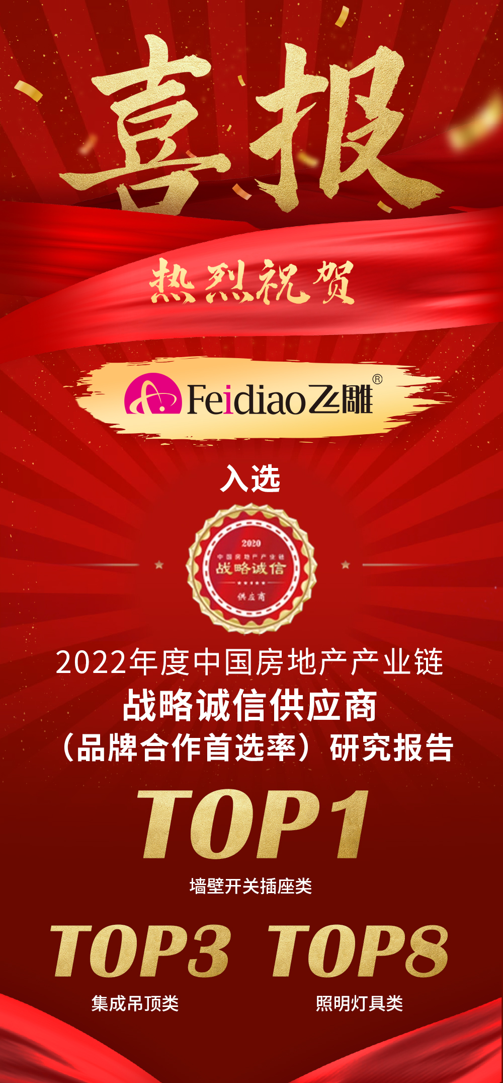 硬核实力!热烈祝贺飞雕电器获评2022中国房地产产业链战略诚信供应商!