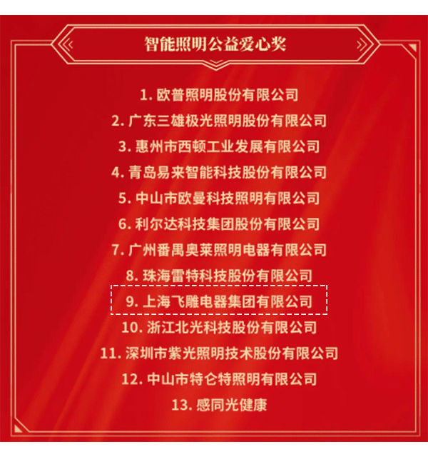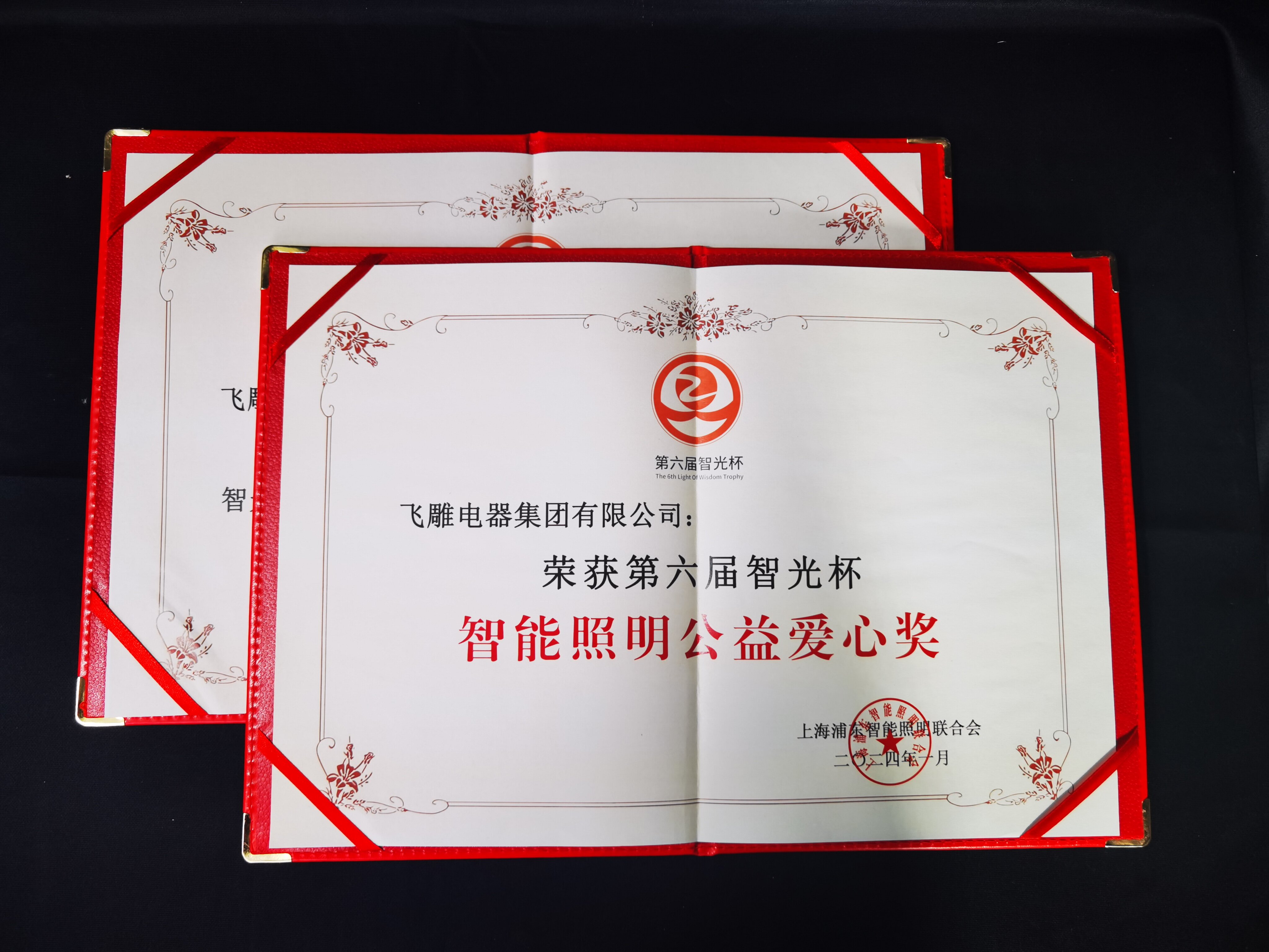 2023年4月26日,SILA第六届“智光杯”跨界奖项名单公布。喜讯传来,飞雕电器凭借创新的技术产品、卓越的客户体验和出色的品牌力等多维优异表现,荣获“智能照明产品创新成果奖“。情系教育行善举,爱心助学暖人心,飞雕电器积极参加“上海浦东智能照明联合会公益助学行动”,荣获“智能照明公益爱心奖”。