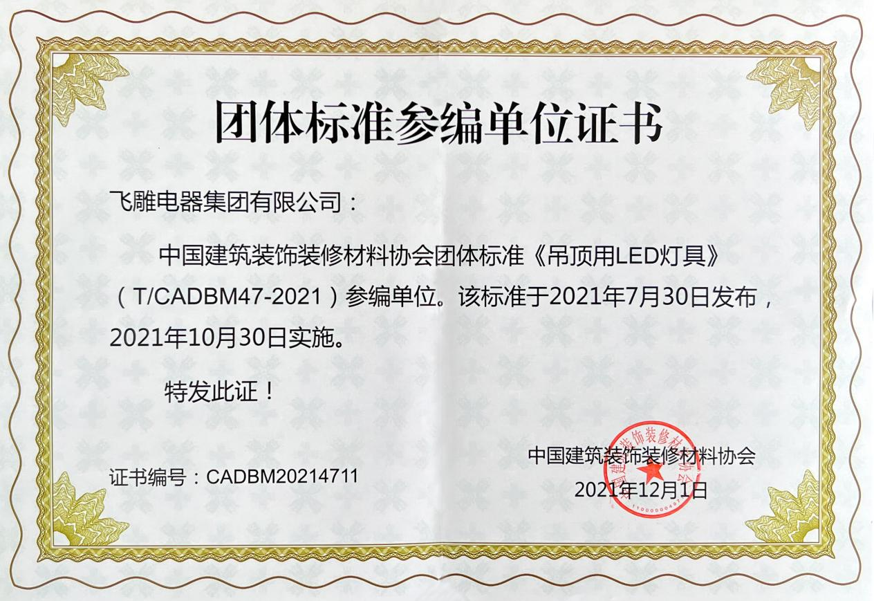 2021年7月30日,由中国建筑装饰装修材料协会、吊灯LED灯具照明产业链多家优秀生产企业,共同编制的《吊灯用LED灯具》行业领先的团体标准正式发布。飞雕电器集团作为本次团体编制单位的一员,坚持以行业标准引领提升,以专业标杆引领LED灯饰照明行业高标准、可持续、环保生态高质量新发展,获得了行业的支持与认可,荣获由中国建筑装饰装修材料协会颁发的团体标准参编单位荣誉证书!