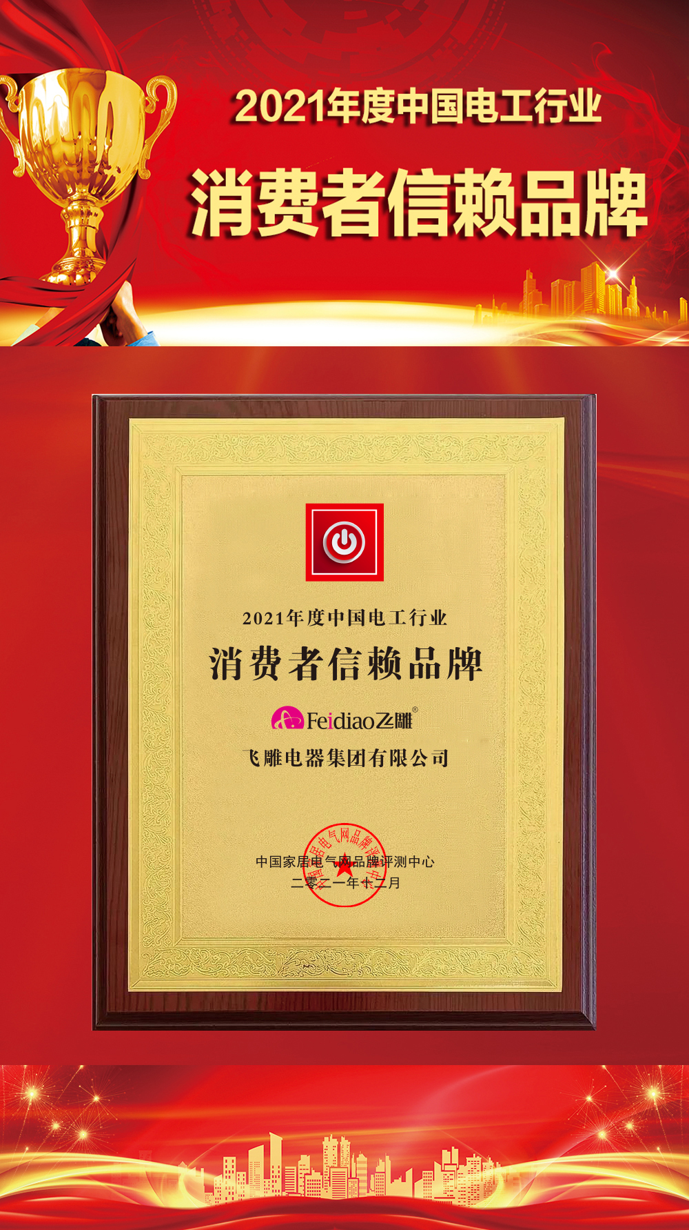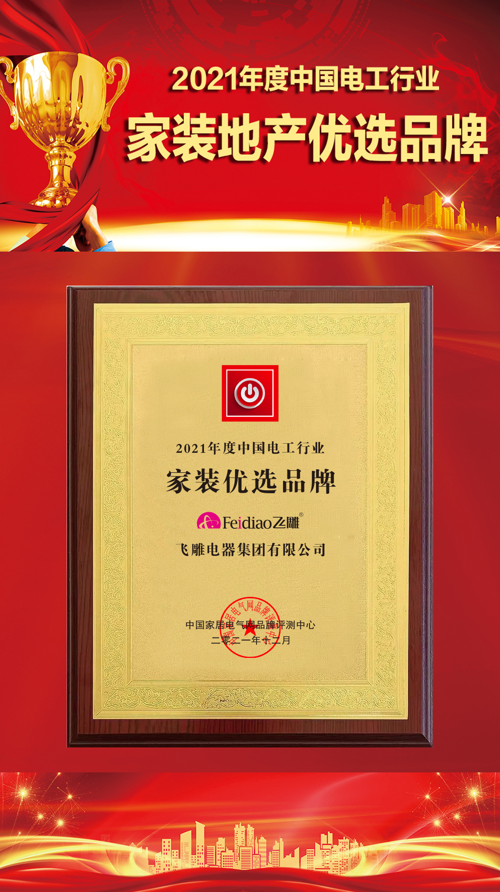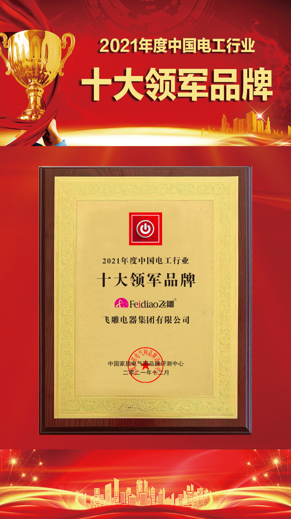 经过近两个月组委会严格评选,2021年度中国家居电气行业优秀品牌评选结果荣耀发布!飞雕电器集团凭借自身实力,在家居电气电工类品牌评选中,斩获三大奖项:
